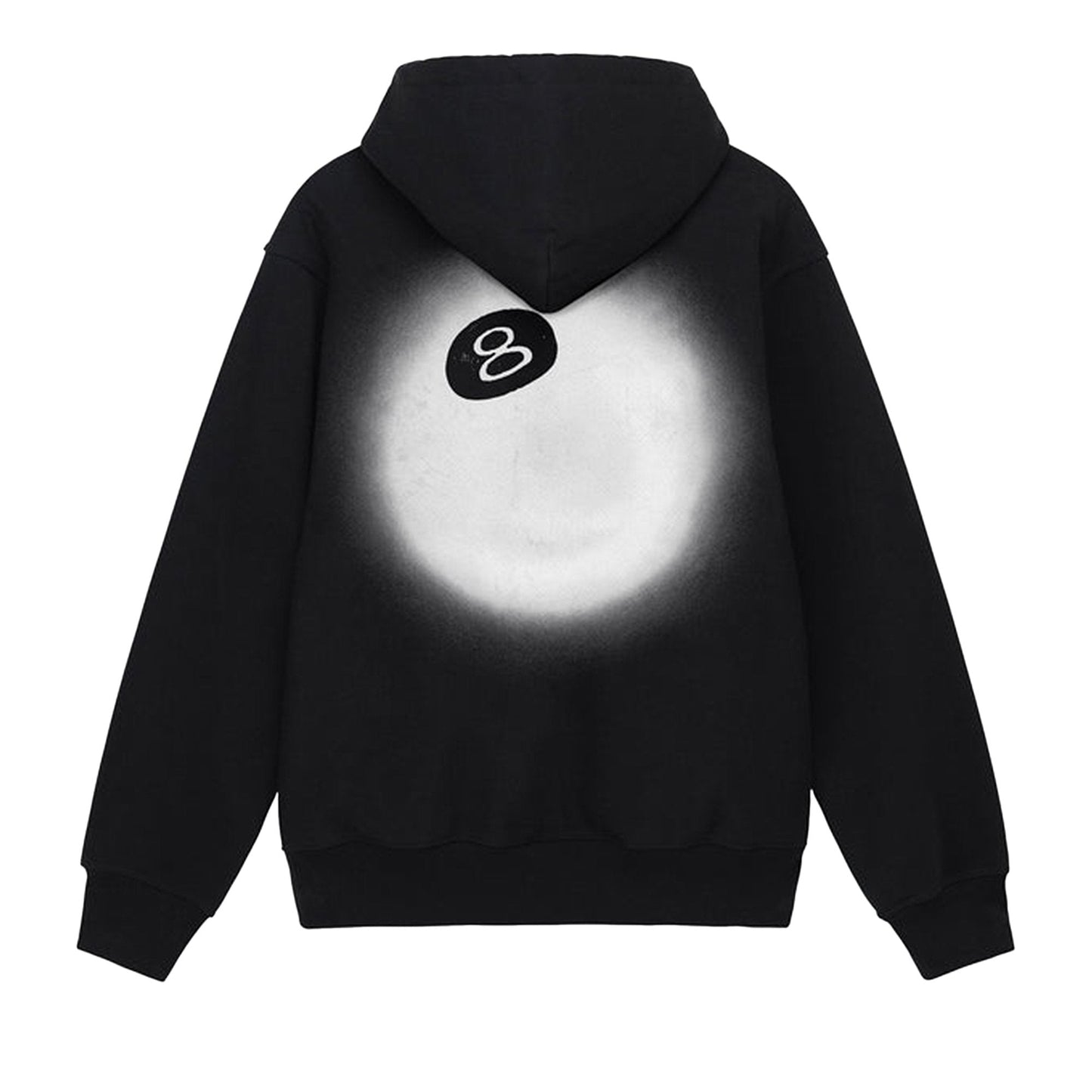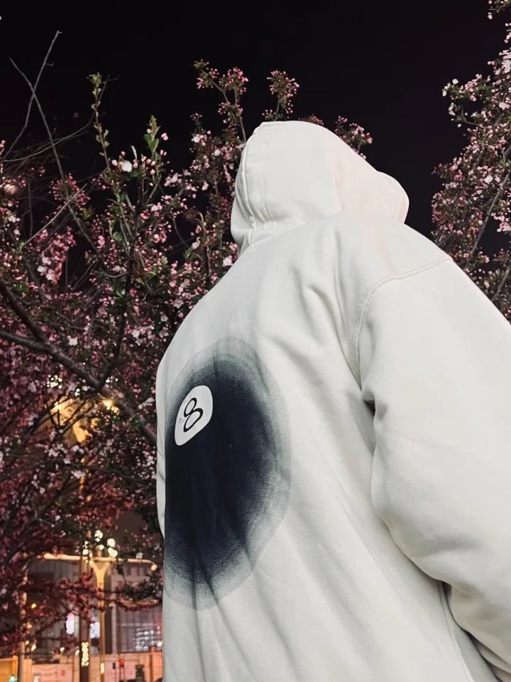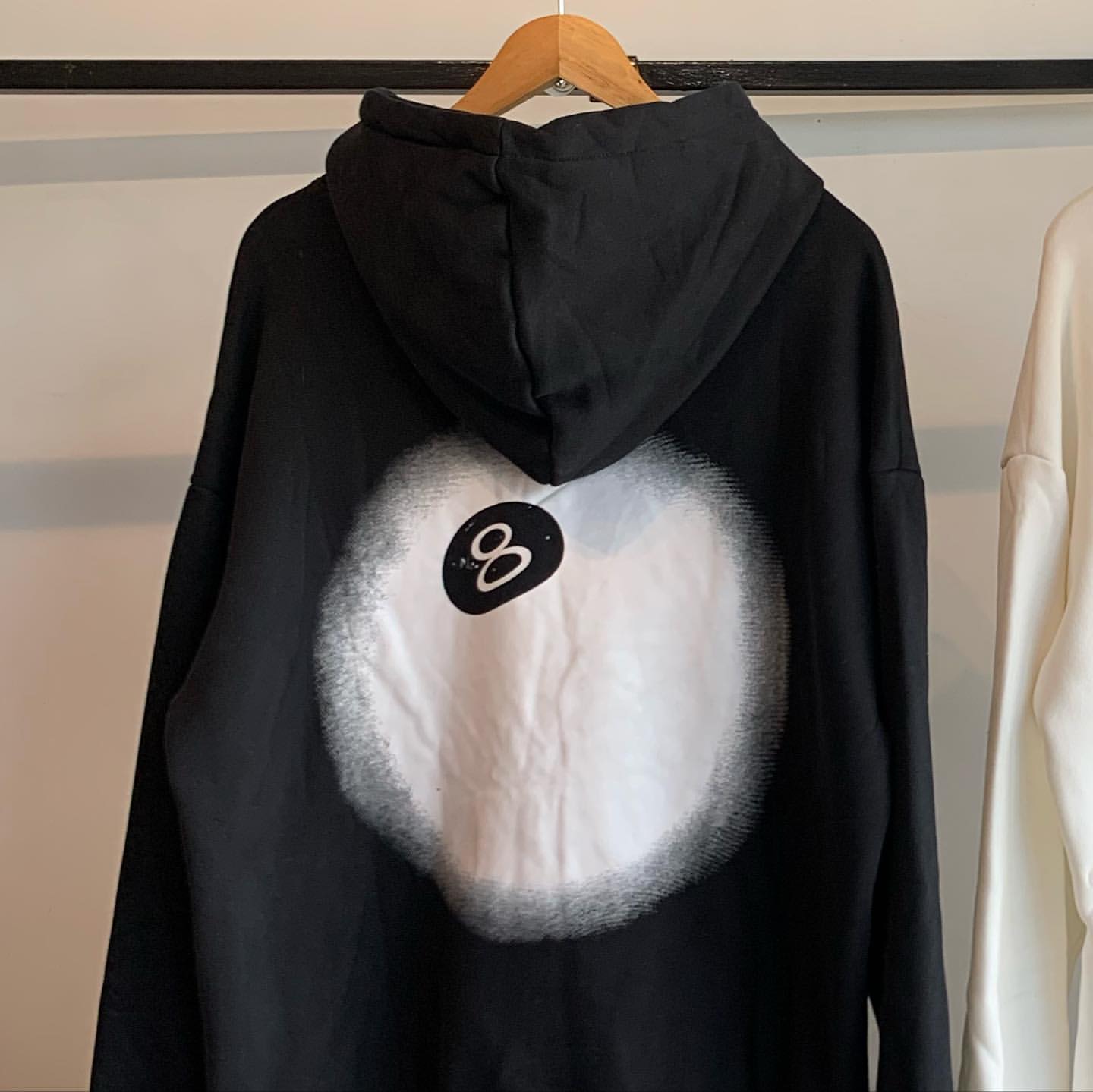This hoodie's minimalist yet bold design features an 8 ball on the back, giving a spray-painted effect.