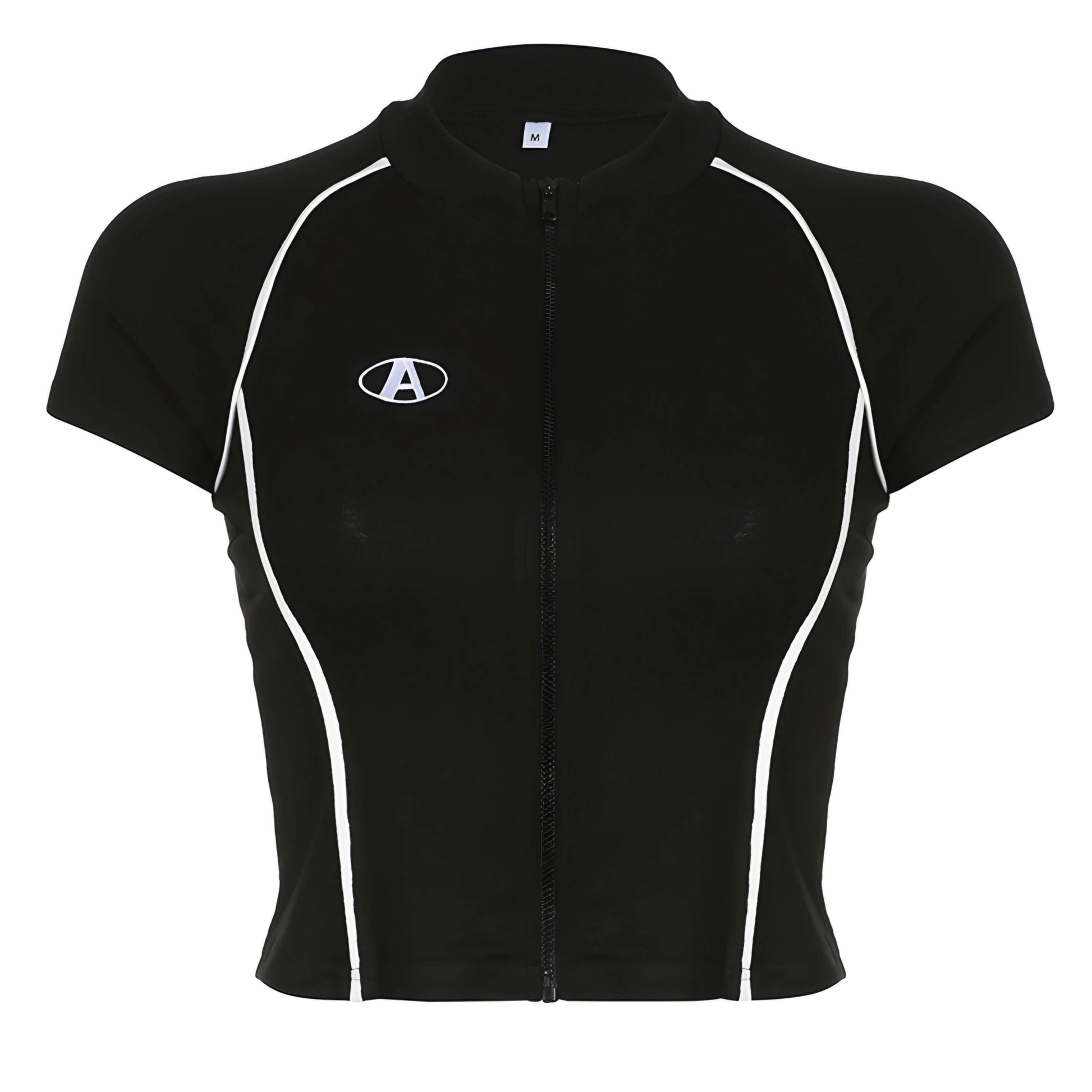 This cropped top features a sleek black base accentuated by striking white piping along the sides, creating a flattering silhouette.