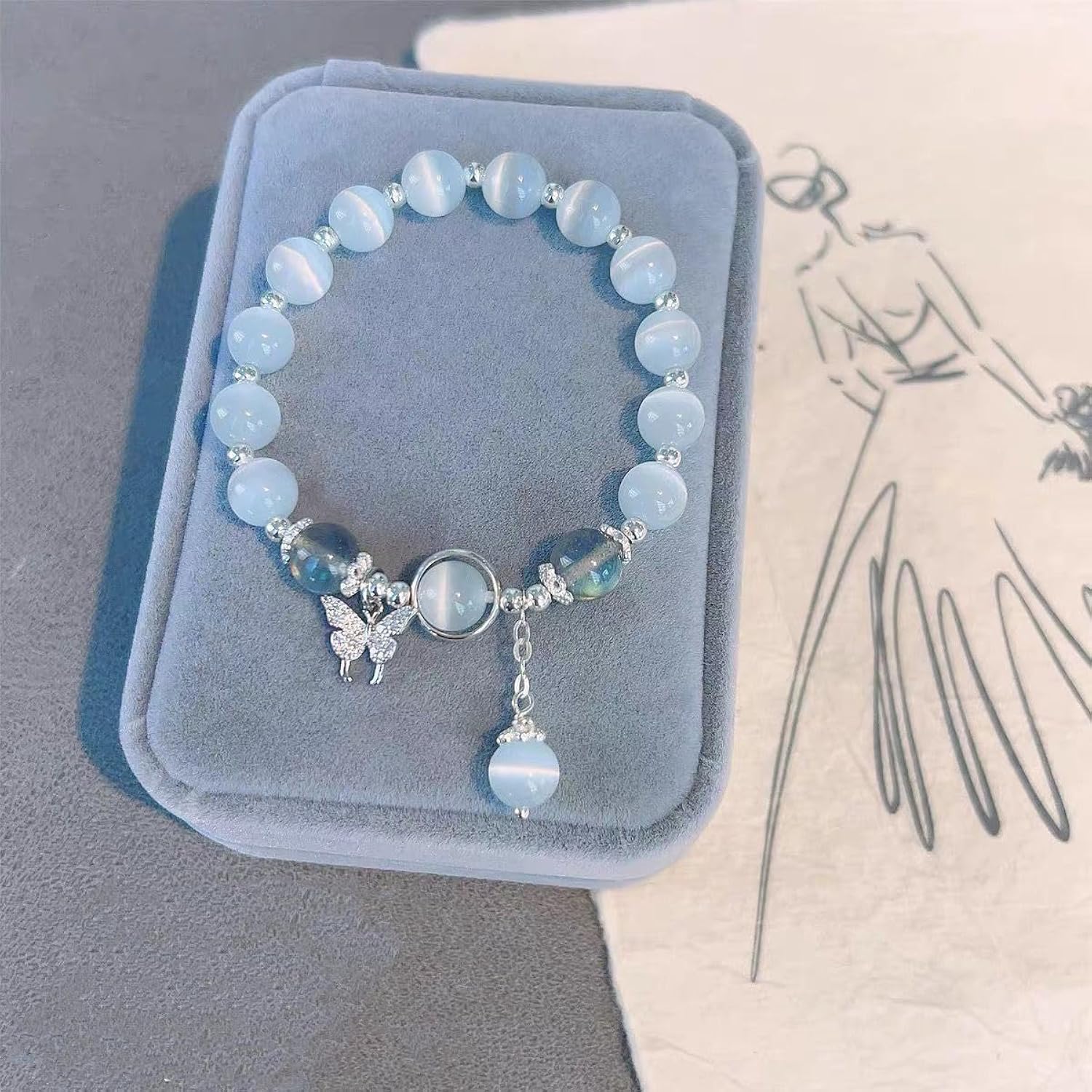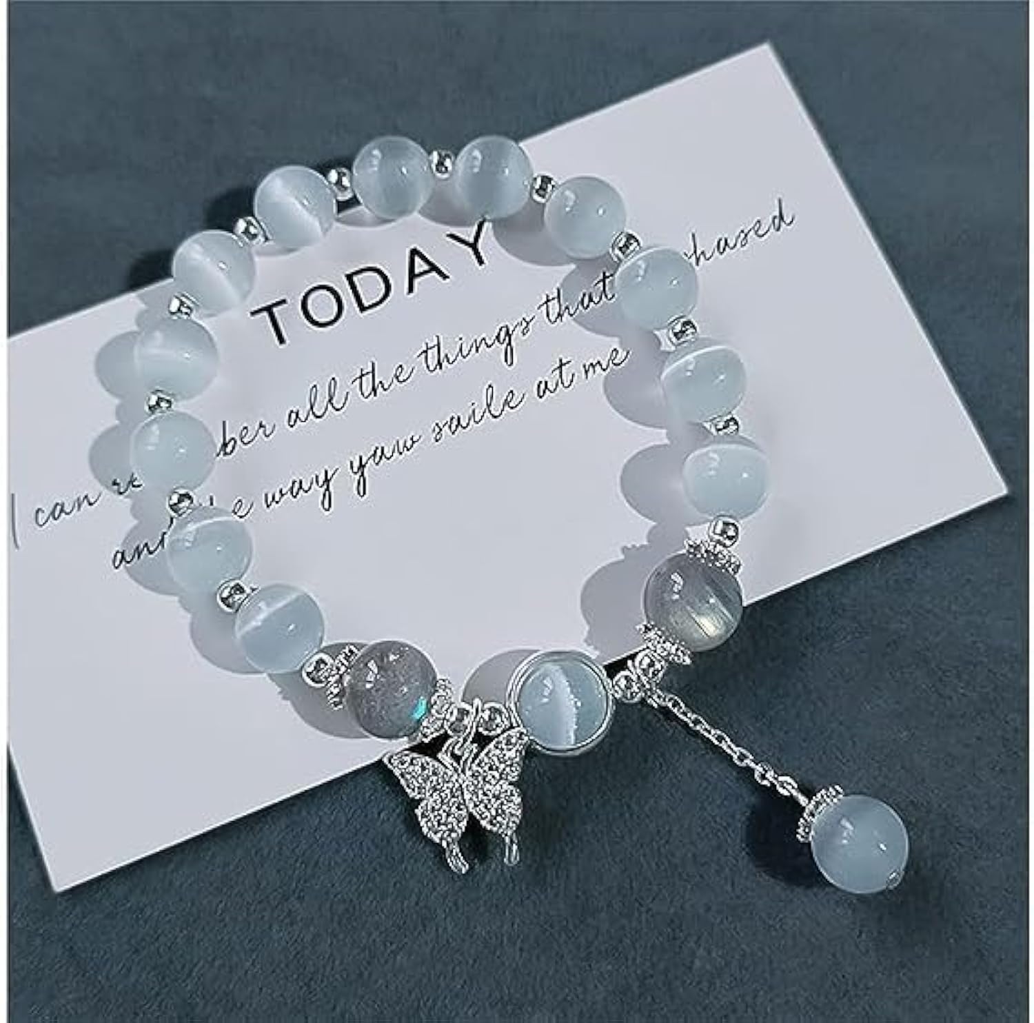 This bracelet features a unique design with cat eye pearls and butterfly charm making it a delicate and graceful accessory.