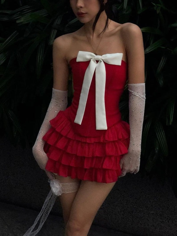 This dress features a striking bow that draws attention to the neckline, offering an exquisite contrast against the fabric.