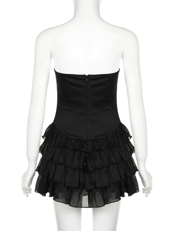 Crafted from luxurious fabric, the fitted bodice seamlessly transitions into a playful tiered ruffle skirt that flounces with every step.