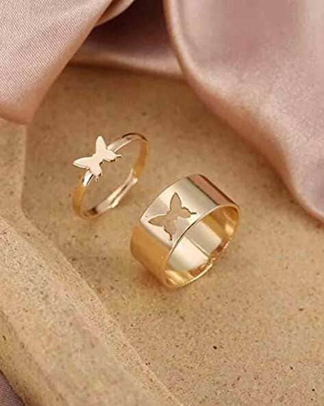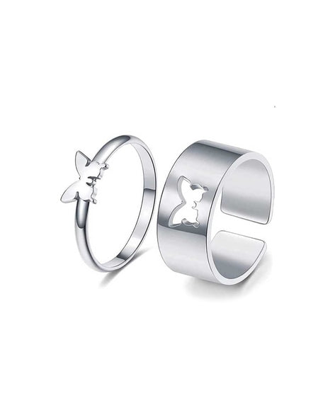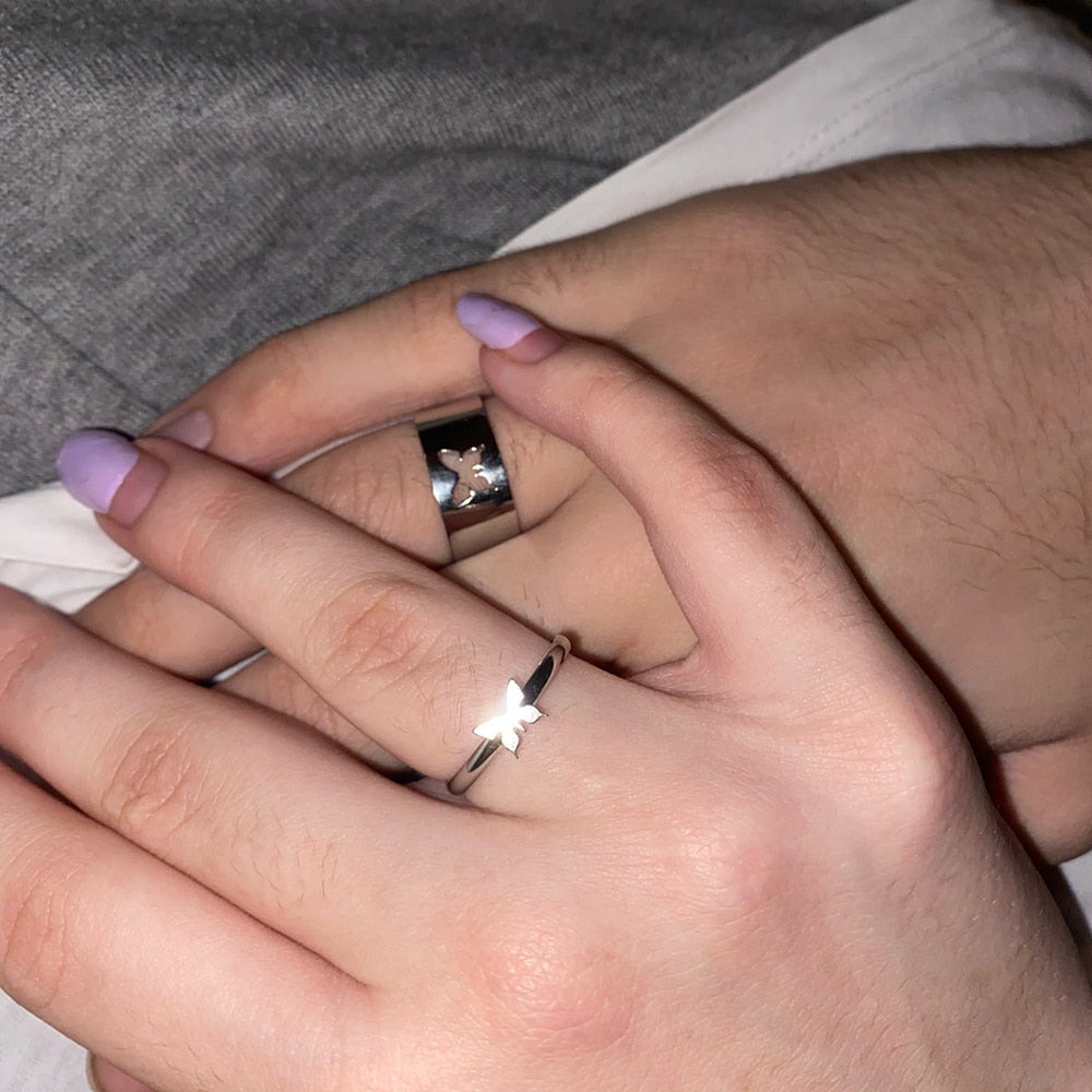 The wide band features a butterfly cut-out, a void to be completed by the narrow band adorned with a butterfly.
