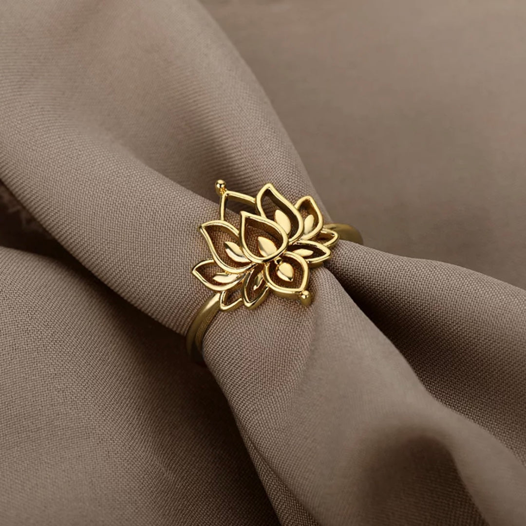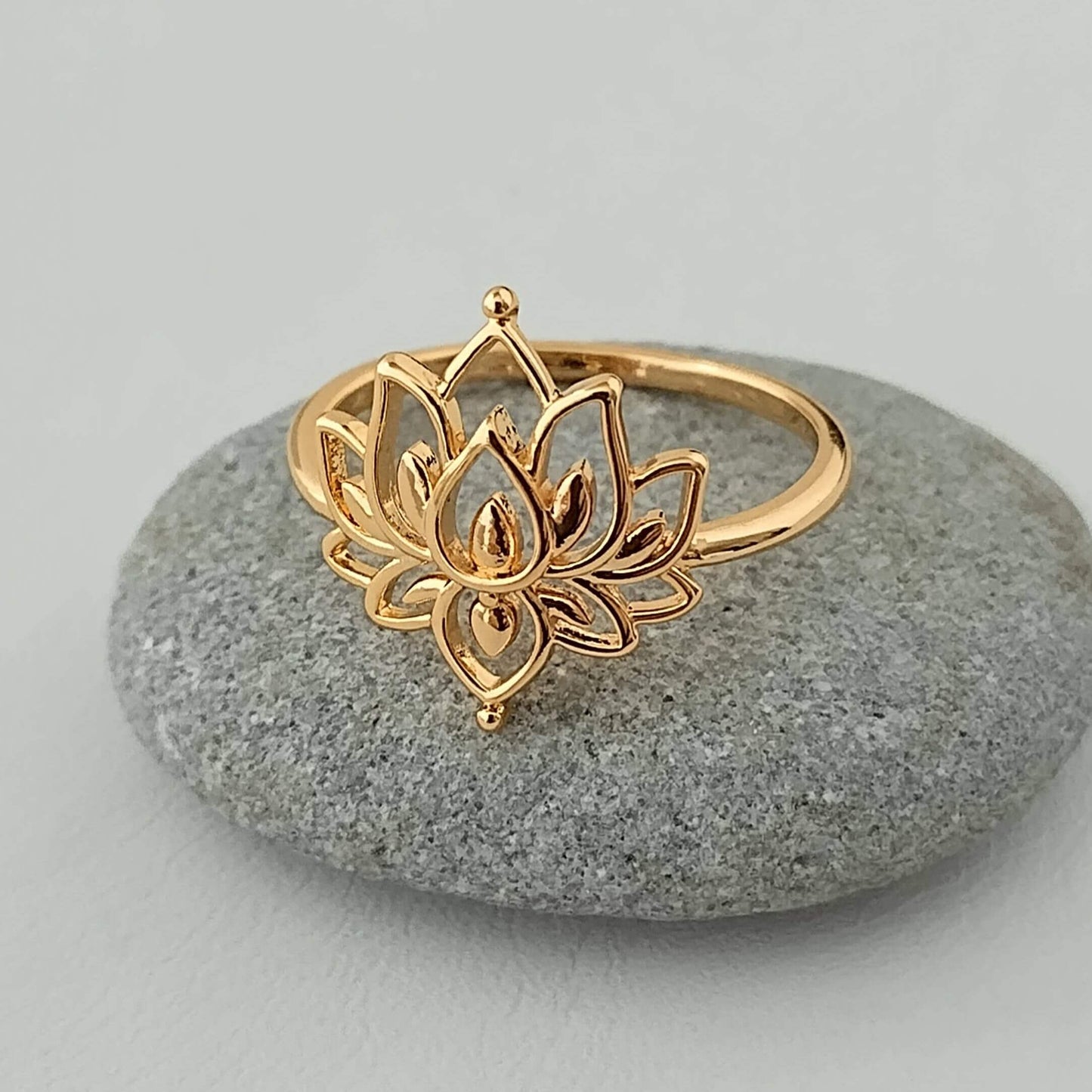 This ring features a delicate band and an intricately designed open-cut lotus flower that sits at the top.