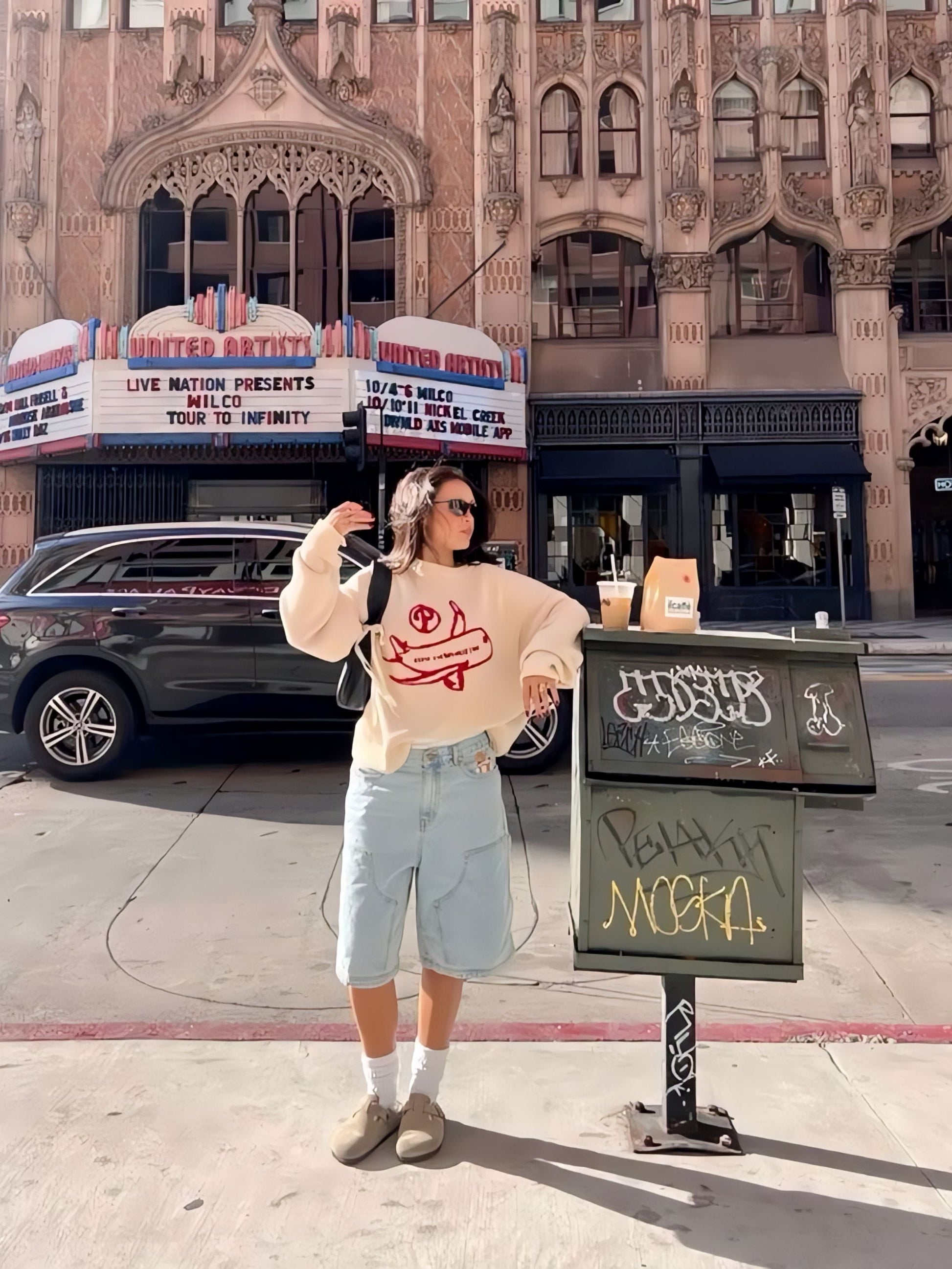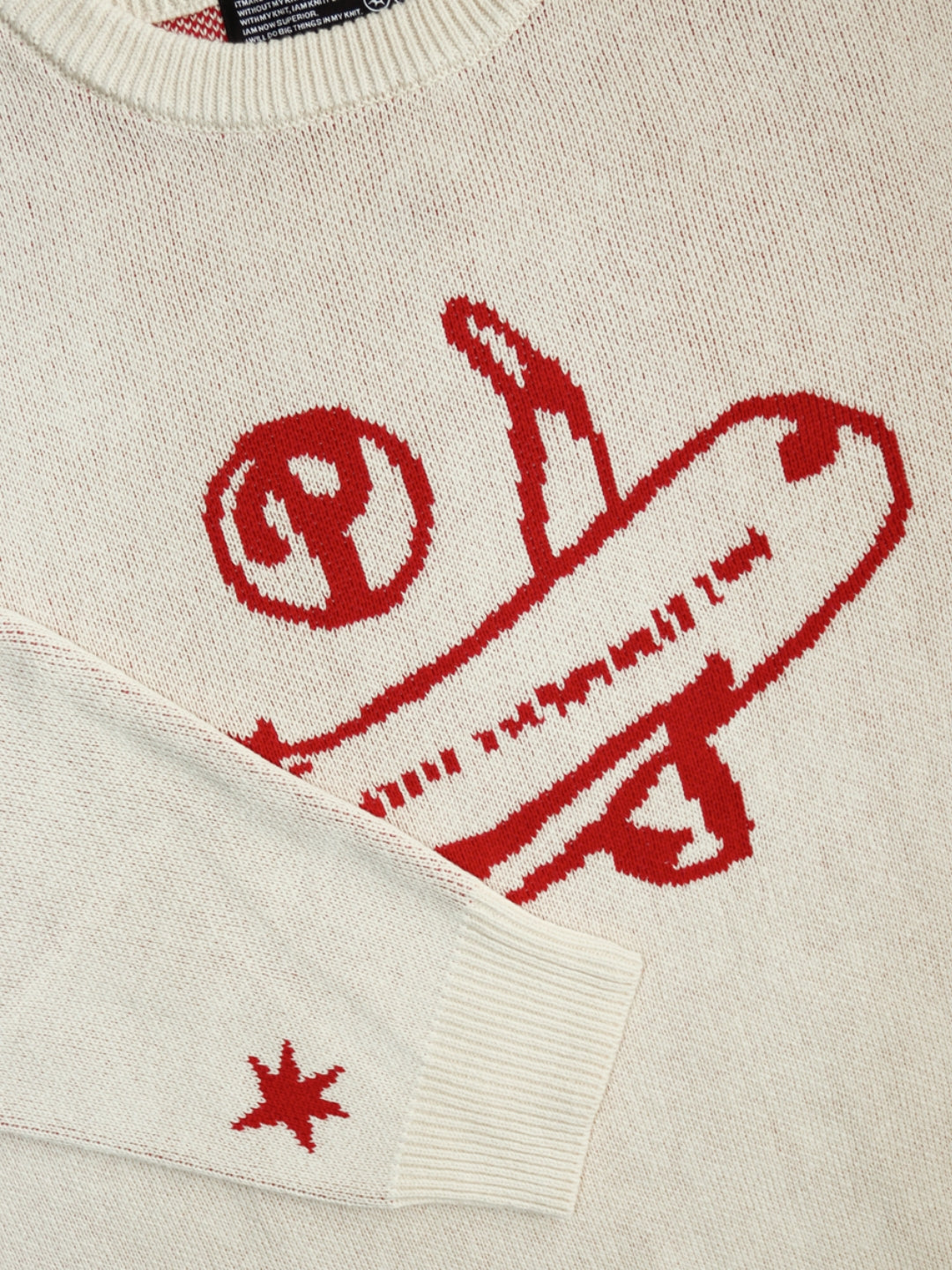 This is a long-sleeve sweatshirt with a red airplane graphic and the letter “P” on the front.