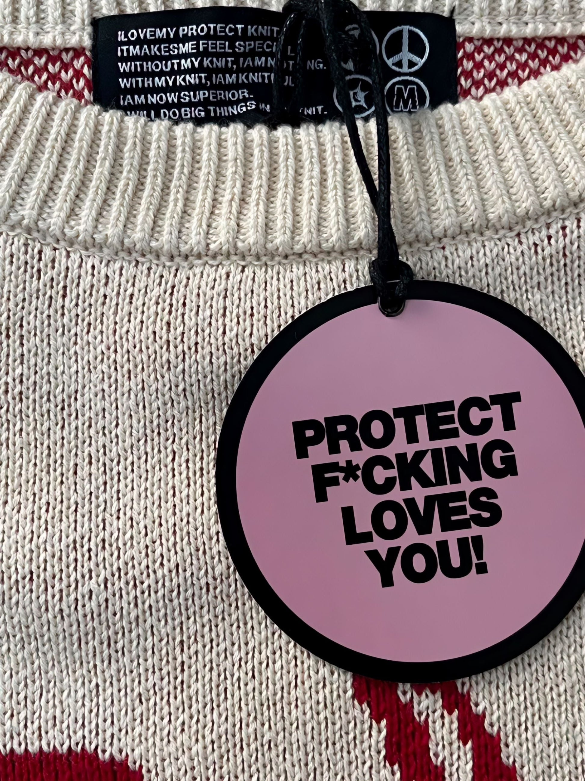 The sweater features a crewneck and a red star on the left sleeve of the sweater.