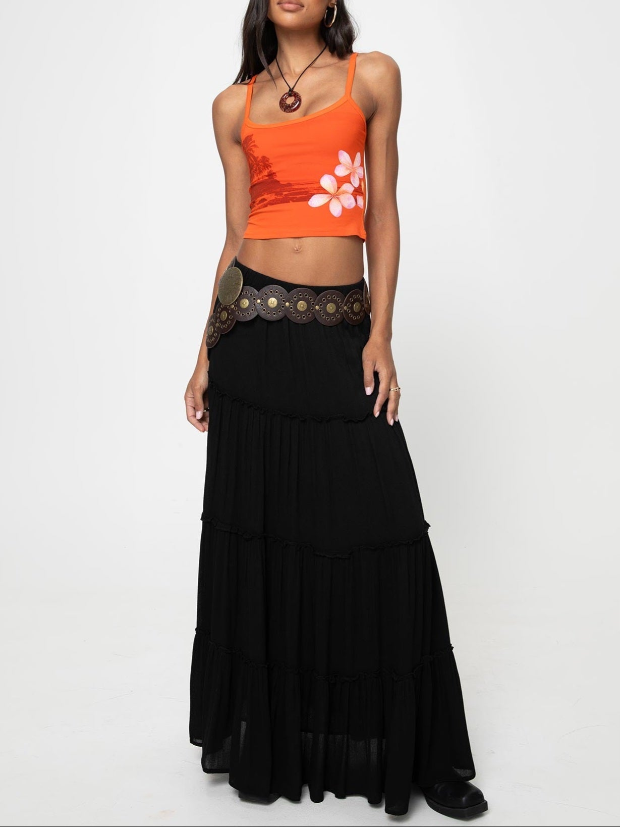 This top features a great sunset scene with palm trees and white flowers that give a tropical vibe.