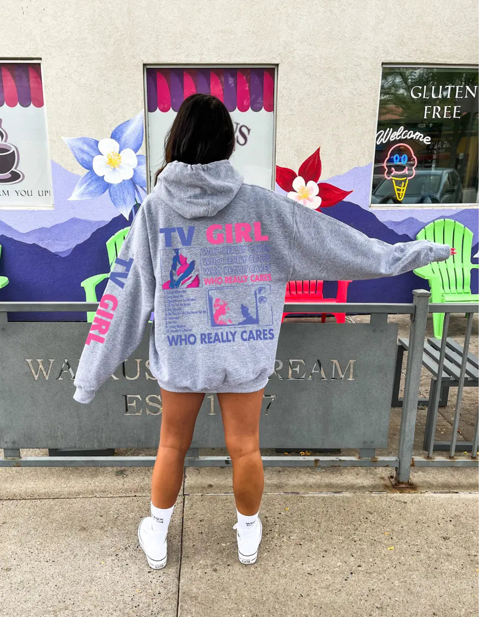The back of the hoodie features bold, vibrant graphics related to TV Girl's album "Who Really Cares."